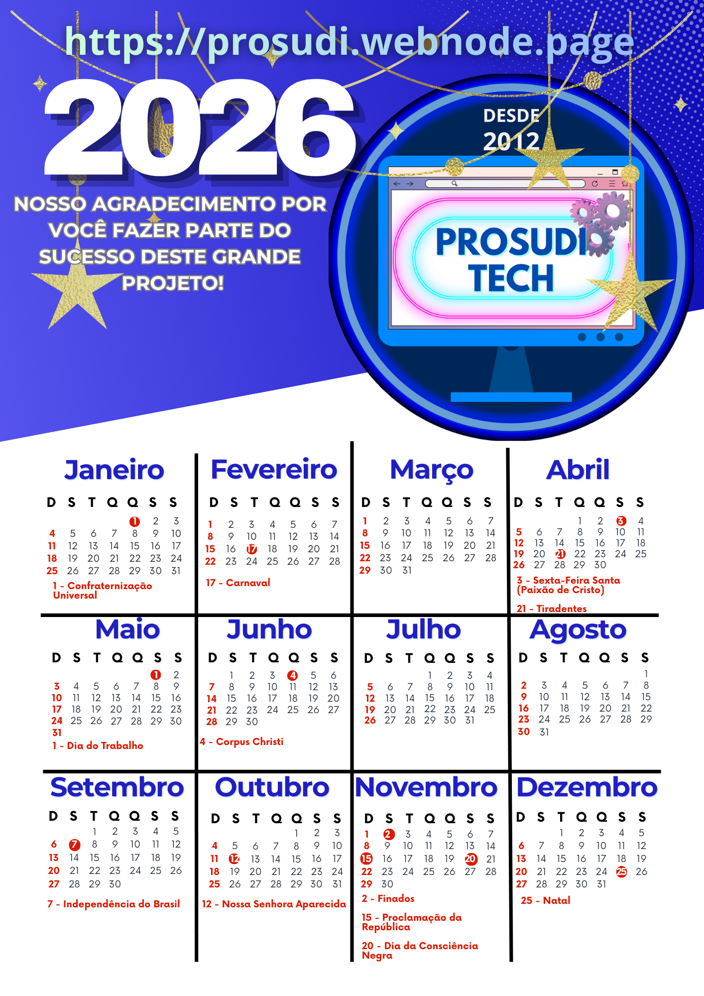 Estamos lançando para você o nosso Novo Calendário 2026 para comemorarmos os nossos quase 14 anos de trabalho que completaremos no dia 27 de fevereiro de 2026. O tempo passa rápido né? Com isso, foram anos de aprimoramentos, novos recursos em nossa página e muito, mas muito trabalho de grandes sucessos para oferecer à você a melhor tecnologia, informações TECH e suporte com atendimentos à milhares de pessoas espalhadas pelo mundo.